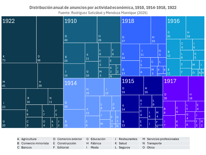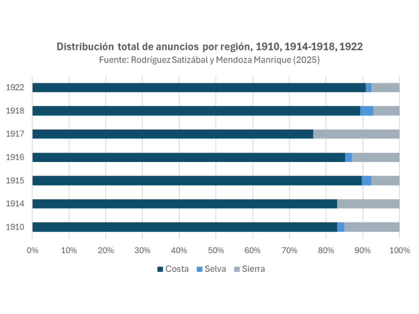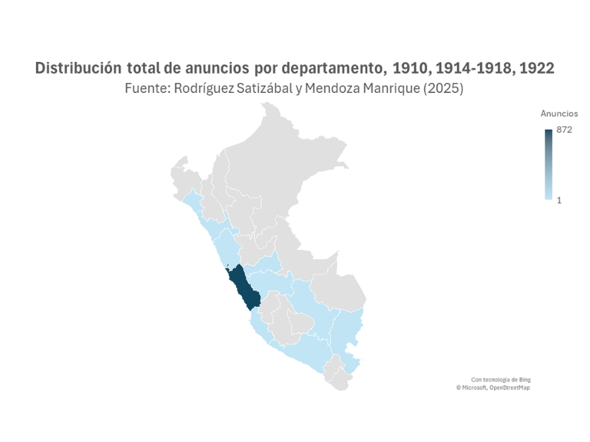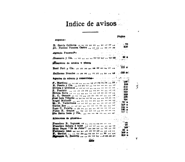 En este proyecto analizamos los anuncios (avisos publicitarios) publicados en el Almanaque El Comercio entre 1892 y 1931. Nuestro objetivo es estudiar las tendencias y particularidades de la actividad empresarial en Perú durante la primera globalización con base en el uso extensivo de esta colección de ediciones anuales. Primero, se revisan los diferentes tipos de anuncios teniendo en cuenta los tamaños, la tipografía y las imágenes incluidas. Segundo, se extrae información de texto de los avisos para identificar y explicar las características y cambios de la actividad empresarial.